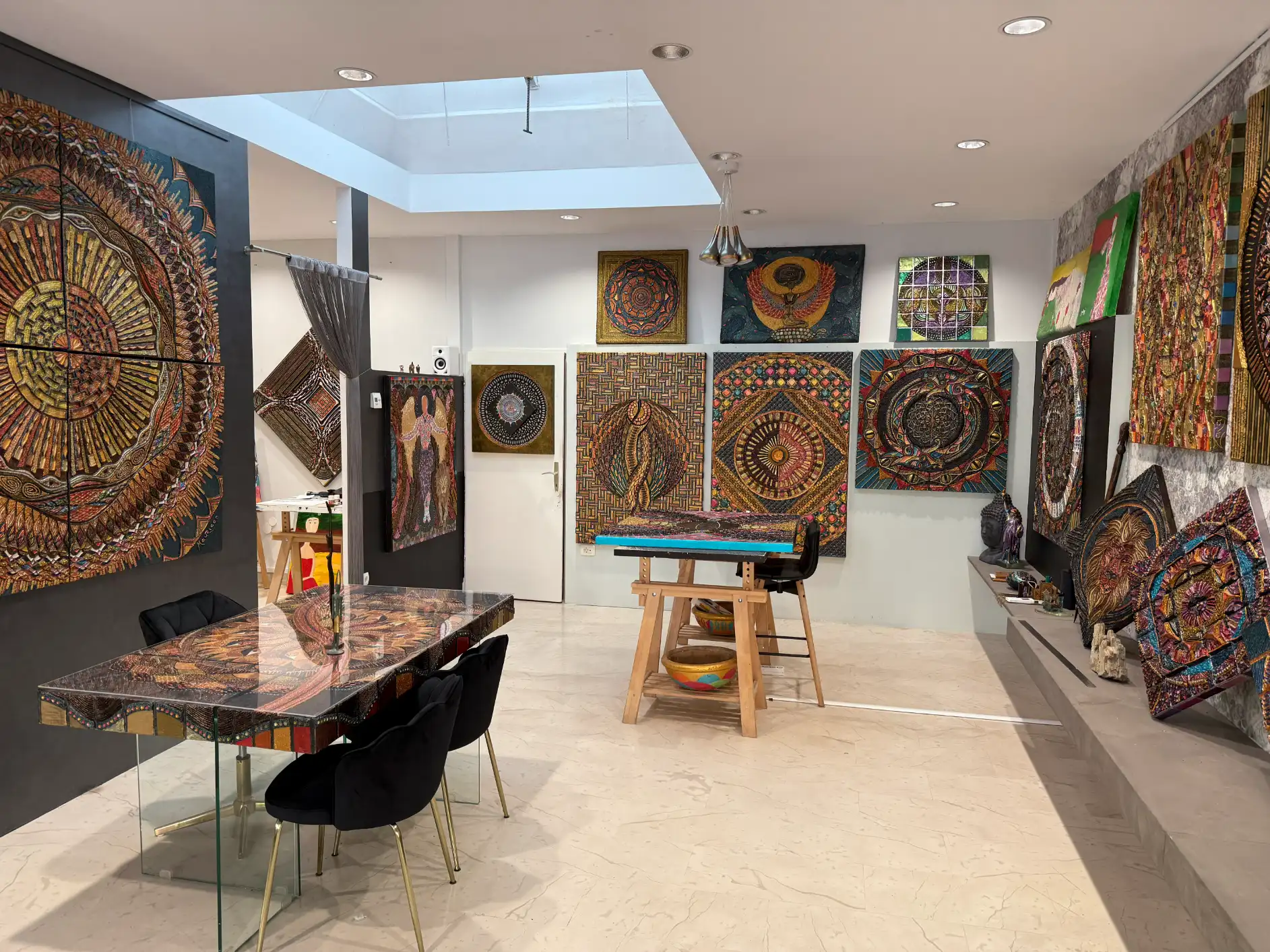 Exhibition Space: The center features a dedicated exhibition area showcasing a diverse collection of Mauricco Zaraj’s visionary artworks. Visitors can explore pieces that delve into themes such as Sacred Geometry, Cosmic Cycles, Celestial Events, and Ancient Symbolism. Each artwork is designed to inspire and provoke thought offering a journey through the mind and soul of the artist.